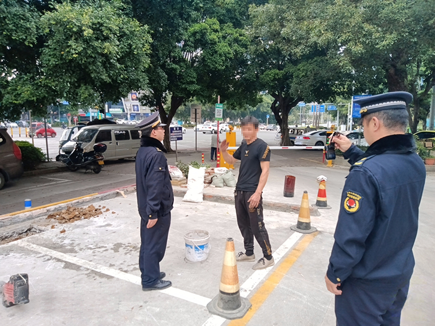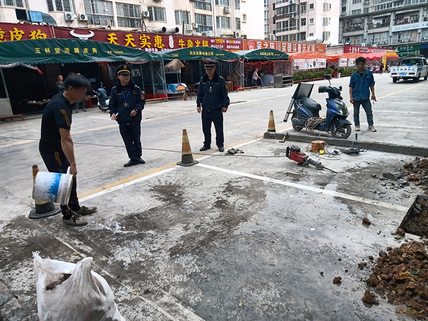 無獨有偶,當天桂中大道一停車場也因切割水泥地面被市民投訴施工揚塵。執(zhí)法人員現(xiàn)場調(diào)查后當即叫停了施工人員的施工,向他們宣講了相關(guān)法律法規(guī)。要求立即整改,采取灑水措施降塵。隨后,施工人員立即進行了整改,派員用水管灑水降塵,清掃塵土。
