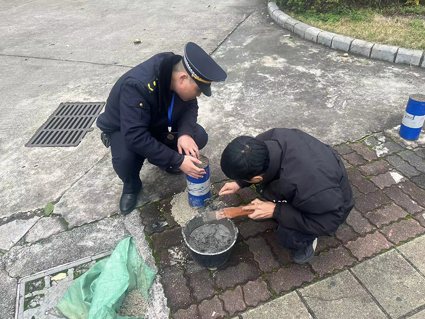 隨后,在執法人員準備前去維修隔離樁時,謝先生主動跟隨前往。在現場和執法人員一起撈泥拌漿,將被撞歪的隔離樁重新扶正加固,恢復原貌。