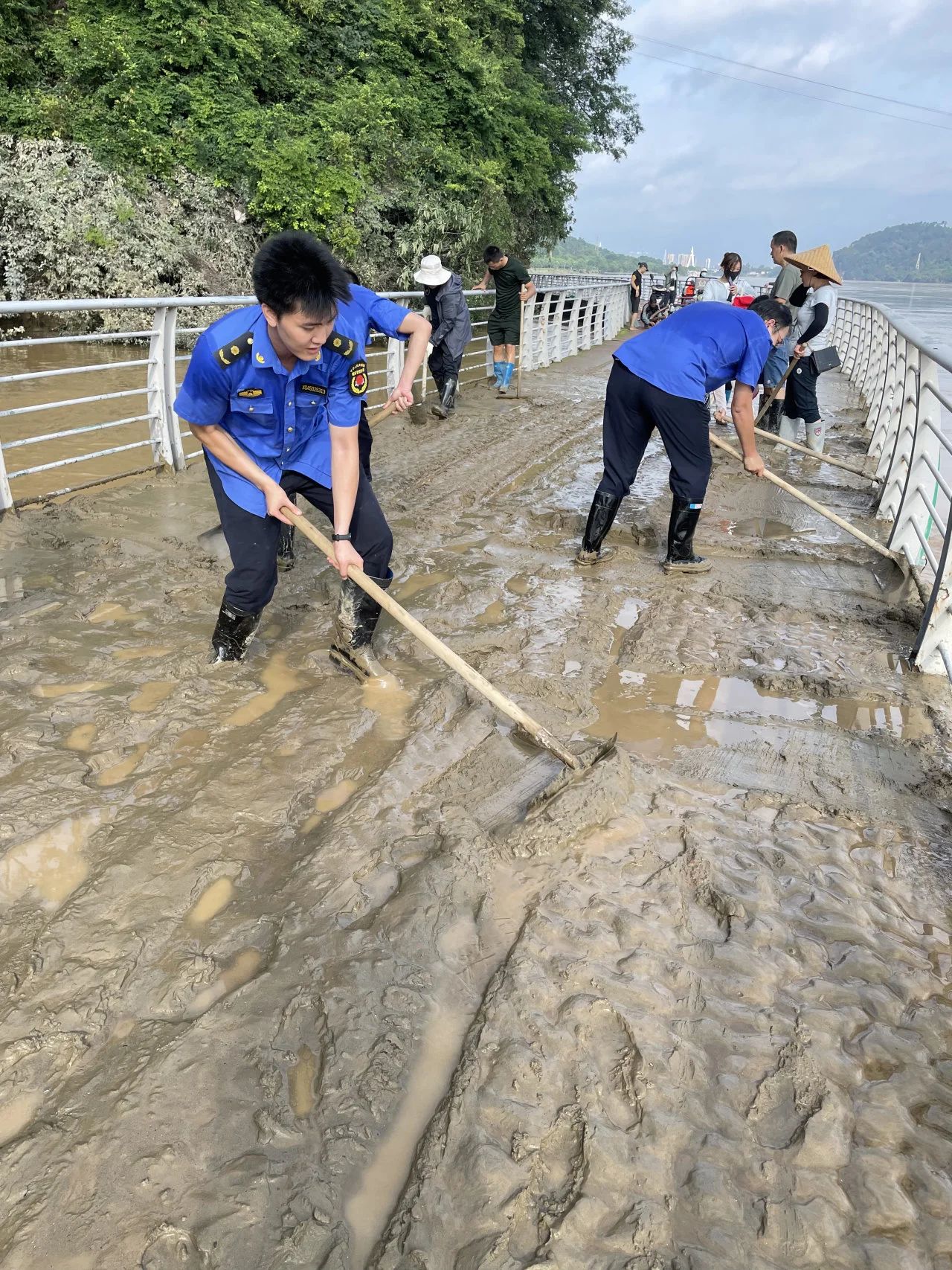 清淤中,執(zhí)法人員刮板、水槍各種工具輪番上陣,對道路上的淤泥雜物進行清理沖洗,清除道路泥垢,至中午12點左右,經(jīng)過連續(xù)6個多小時的奮戰(zhàn),恢復道路通行,順利完成清淤任務(wù)。