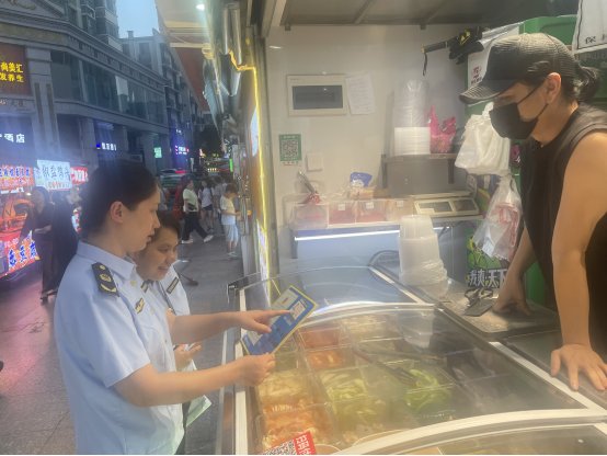 為進一步規范夜市經營秩序,保障消費者飲食安全,促進夜間經濟健康有序發展,城中區市場監督管理局啟動股所聯動機制,針對轄區內的網紅打卡點——五星美食街和風情港夜市,采用“邊發現、邊指導、邊規范”的創新工作模式,全面開展夜市風險排查和監督檢查專項行動,為監督檢查工作按下“加速鍵”。“三邊”模式精準護航,高效規范夜市經營。行動中,市場監管局執法人員深入夜市各食品經營攤位,展開“地毯式”排查。嚴格遵循“邊發現、邊指導、邊規范”的工作要求。執法人員細致審查食品攤販的經營資質,嚴謹核實食品攤販登記卡、食品備案卡的辦理及公示情況,并全面檢查食品原料采購渠道、加工操作流程、經營場所的環境衛生等。針對發現的個別攤位存在的散裝食品標識標簽不規范、三防設施不到位等問題,執法人員當場進行細致指導,詳細講解食品安全知識與操作規范,要求攤主立即進行整改,并持續跟蹤復查,確保問題徹底整改到位。